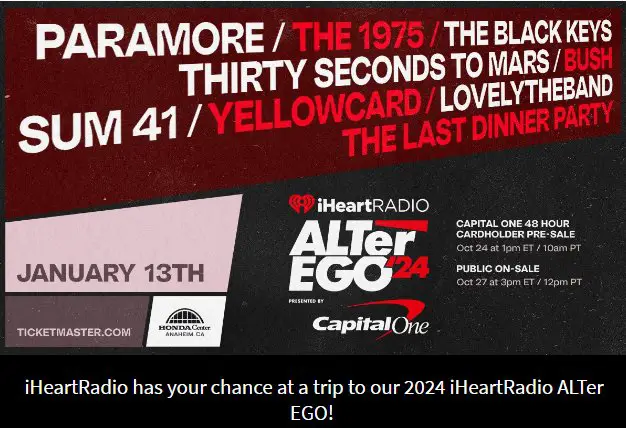 The trip package includes round-trip domestic, coach air transportation for one grand prize winner and one eligible guest, two nights’ hotel accommodations (standard hotel room, and two tickets to attend the 2024 iHeartRadio ALTer EGO at The Honda Center in Anaheim, California on Saturday, January 13, 2024.