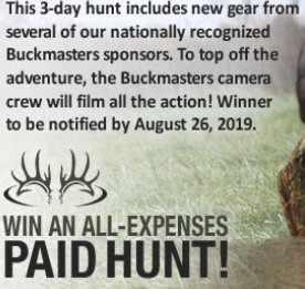 Winner will receive a 3-day hunt on December 2-5, 2019, in Olla, LA; includes room and board, all travel arranged and paid for by Buckmasters and more! Sign up for the newsletter to enter.