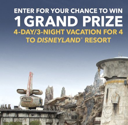 Win a trip for 4 to Disneyland in Anaheim, CA including airfare, hotel stay, park passes, $400.00 Disney gift card and more. Enter for a chance to come live your very own Star Wars story in a whole new land where a galaxy far, far away unfolds all around you.