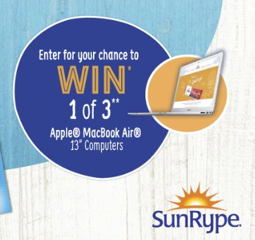 3 winners will get an Apple MacBook Air 13” and an assortment of SunRype snacks. Fill out the entry form and upload a photo featuring you or your family with your favorite SunRype snacks for 10 extra bonus entries for your chance to win.