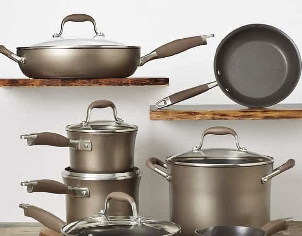 An Anolon Advanced Bronze Hard-Anodized Nonstick Cookware Set from Steamy Kitchen. The cookware set’s Anolon SureGrip handles offer a solid, comfortable grasp and are dual riveted for strength.