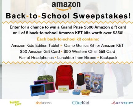 (5) winners: School prize package (ARV: $364.96) which includes:(1) Amazon Fire 7 Kids Edition tablet (7″ display with kickstand) (value $99.99), (1) Osmo Genius Kit for KET (value $99.99), (1) set of headphones for kids (value $14.99), $50 Western Chief gift card (value $50), $50 Amazon gift card (value $50), Backpack (value $30)and a Bixbee lunchbox (value $19.99).
