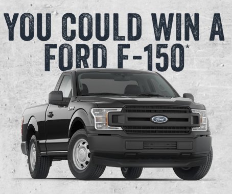 Grand Prize: 3 year lease of a Ford F150 awarded as $12,000.00 check. Complete the Sweepstakes registration form.