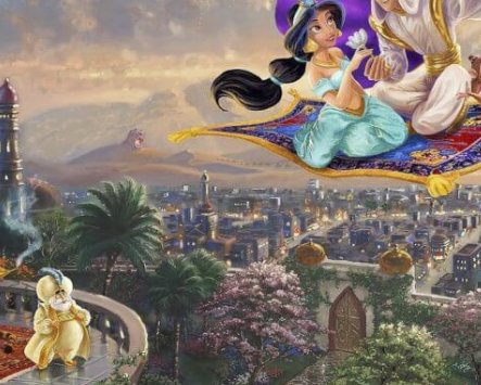Win an Aladdin painting from the Thomas Kinkade Studios, worth $795.00! Aladdin and Princess Jasmine soar above Agrabah and the surrounding kingdom on a magic carpet ride, they discover a “whole new world” of adventure and love.
