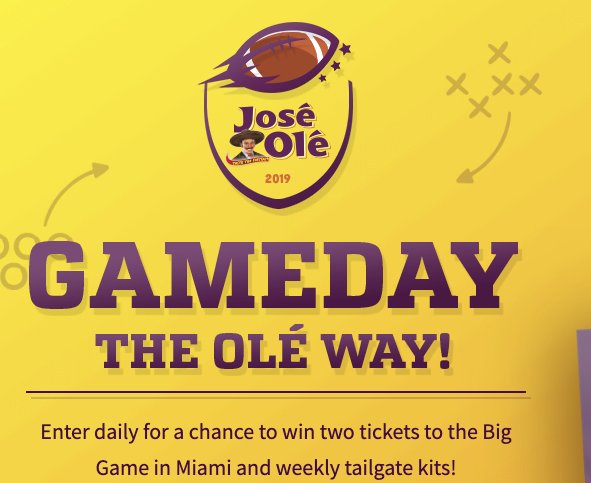 Win a $15,200.00 trip for 2 to attend The Big Game on February 2, 2020 in Miami, FL. Includes airfare, two game tickets and money for lodging. Don’t forget to stock up on Jose Ole taquitos and burritos to make the most of your gameday!