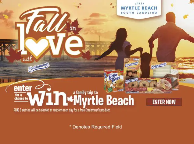 The sponsor Entenmann's, is giving away a trip for 4 to Myrtle Beach, SC including airfare, beachfront accommodations, and passes to an area attraction. Must be 25 years of age and older to enter.