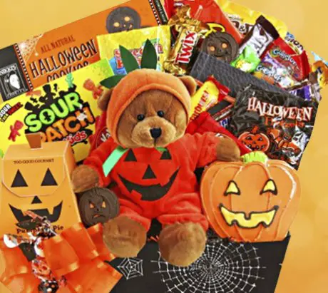 Twix Halloween Pumpkin Delight Gift Basket filled with Pumpkin Pie taffy, chocolate cookies, sour patch candies, a variety of Halloween candy, assorted Wonka candies, a delectable iced Jack-O-Lantern sugar cookie and topped off with a cute plush bear in a pumpkin costume.