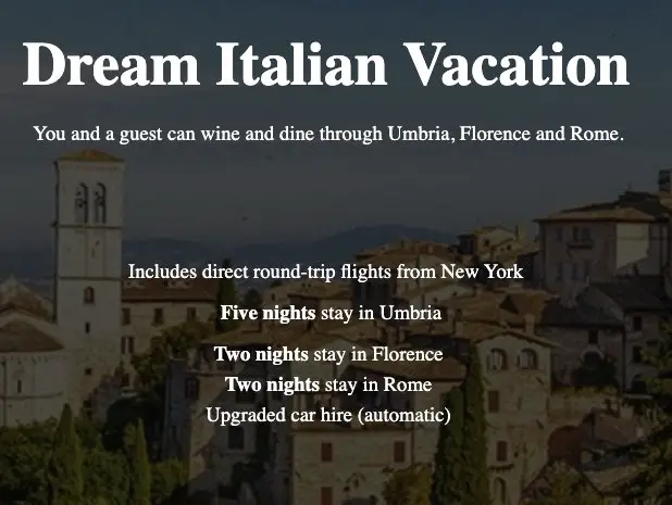 Win a $4,500.00 Dream Italian vacation for 2 from PureWow and TravelZoo. Includes direct round-trip flights from New York, five nights stay in Umbria, two nights stay in Florence, two nights stay in Rome, and car hire.