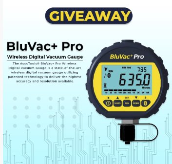 Win a Bluvac+ Pro! The AccuTools BluVac+ Pro Wireless Digital Vacuum Gauge is a state-of-the-art wireless digital vacuum gauge utilizing patented technology to deliver the highest accuracy and resolution available.