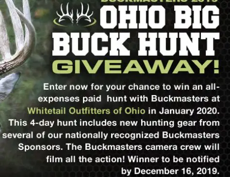 Prize: 4-day hunt with Buckmasters at Whitetail Outfitters of Ohio in January 2020; includes travel arrangements, room and board, clothing, and more. Sign up for newsletter to enter.