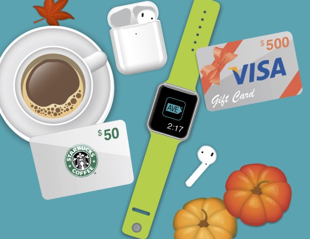 Pair of Apple AirPods, an Apple Watch, a $500.00 Visa gift card and a $50.00 Starbucks gift card.Entry Form