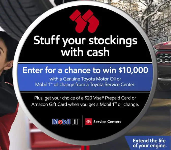 Enter for a chance to win $10,000.00 with your Genuine Toyota Motor Oil or Mobil 1 oil change at a participating Toyota Service Center.