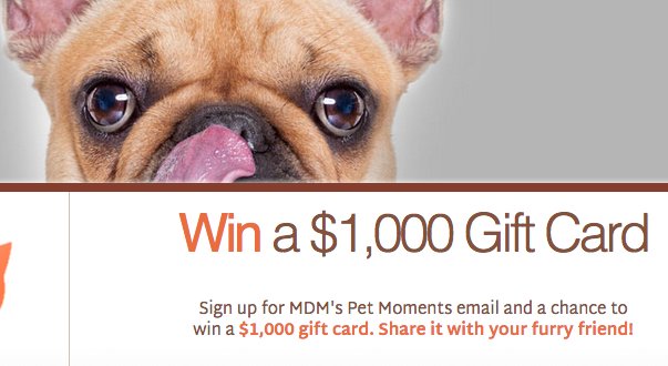 Attention Pet Loves, how about some help buying pet food and supplies? Sign up for MDM's Pet Moments email and you will earn a chance to win a $1,000 gift card.