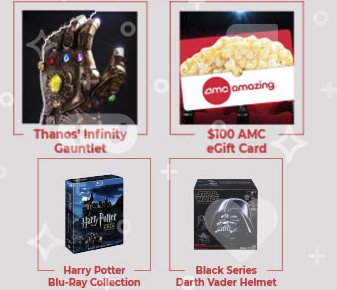 Win your choice of a Thanos' Infinity Gauntlet or a $100 AMC gift card, a Harry Potter DVD Collection or Darth Vader's Helmet.