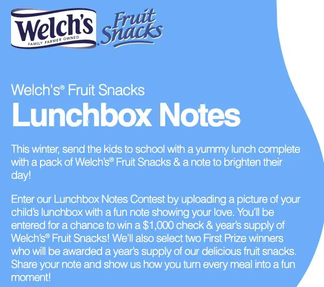 Do you show your child you love them by packing cute notes with their lunches? Then win a $1,000.00 check and a one-year supply of Welch's Fruit Snacks. Just upload a picture of your child's lunchbox with a fun note showing your love.