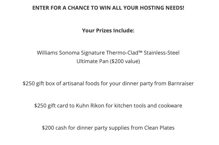 Winner will receive a Williams Sonoma Signature Thermo-Clad Stainless-Steel Ultimate Pan, Barnraiser gift box, $250 Kuhn Rikon gift card, and $200 cash. Sign up for newsletter to enter.