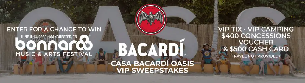 The Casa Bacardi Oasis VIP sweepstakes (“Promotion”) is open only to natural persons who are legal residents of the 50 United States (and the District of Columbia), who will be in the area of the city of Manchester, TN from June 11, 2020 to June 14, 2020, who have a valid social security or tax ID number and who are at least twenty-one (21) years old at the time of entry. VOID IN PUERTO RICO, U.S. VIRGIN ISLANDS, AND OTHER U.S. TERRITORIES AND POSSESSIONS, AND WHEREVER PROHIBITED OR RESTRICTED BY LAW. Promotion may only be entered from and in eligible jurisdictions. Promotion Entities, prize providers, and their parent, subsidiary and affiliate companies, employees, agents and suppliers, and the immediate family (spouse, parents, siblings and children) and household members of each such person are not eligible to participate or win any prize. Administrator may request any potential winner to provide proof that such person is the winner. In the event of a dispute as to the identity of an entrant, the authorized account holder of the account will be deemed to be the entrant. All potential winners are subject to verification before any prize will be awarded. By participating in the Promotion, entrant fully and unconditionally agrees and accepts these Official Rules and Administrator’s decisions, which are final and binding in all matters related to the Promotion. Winning a prize is contingent upon fulfilling all requirements set forth herein.Added