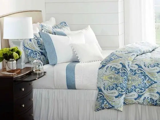 Bedroom Makeover from Country Curtains including Bahama Paisley Duvet Cover, Down/Feather Filled Duvet Insert 400-thread count in F/Q, Bimini quilted white coverlet in F/Q, Blue Bordered Sheet Set in Q, Classic Ball Fringe Bed Skirt in Q, Classic Ball Fringe Decorative Pillow, 2 pairs 84" L Classic Ball Fringe Curtains in white, Hayward Night Stand in Black and Arlo Table Lamp in White. ARV $1,000Entry Form