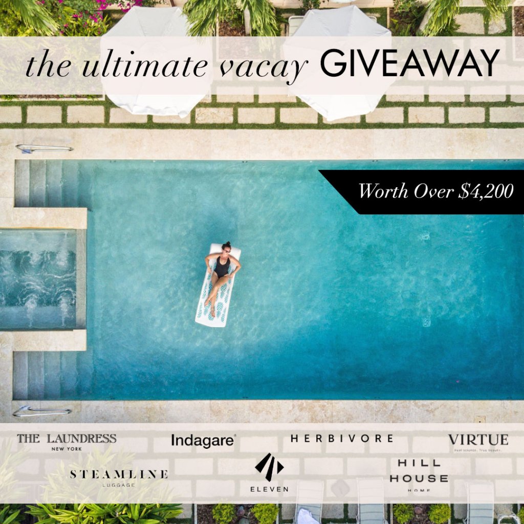 The Ultimate Vacay Giveaway is giving you a chance to win $4200 in prizes including a $2500 three night accommodation for 2 at The Eleven Experience Bahamas House, $250 Virtue Labs gift card, $300 The Laundress gift card, $250 Hill House Home gift card, $200 Herbivore Botanicals gift card and more