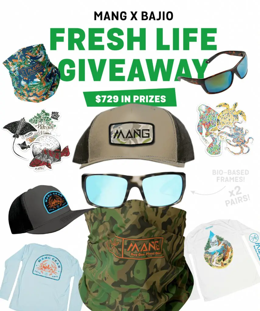 The $729 prize package includes 2 pairs of Bajio sunglasses and some MANG gear including hats, neck gaiters, sticker packs and shirts of your choosing