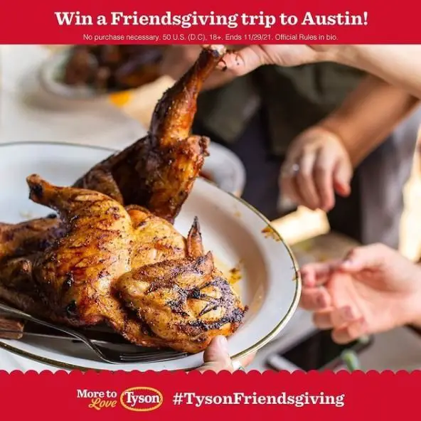 The Tyson Brand Friendsgiving Sweepstakes is offering you a chance to win a trip for 10 to Austin.