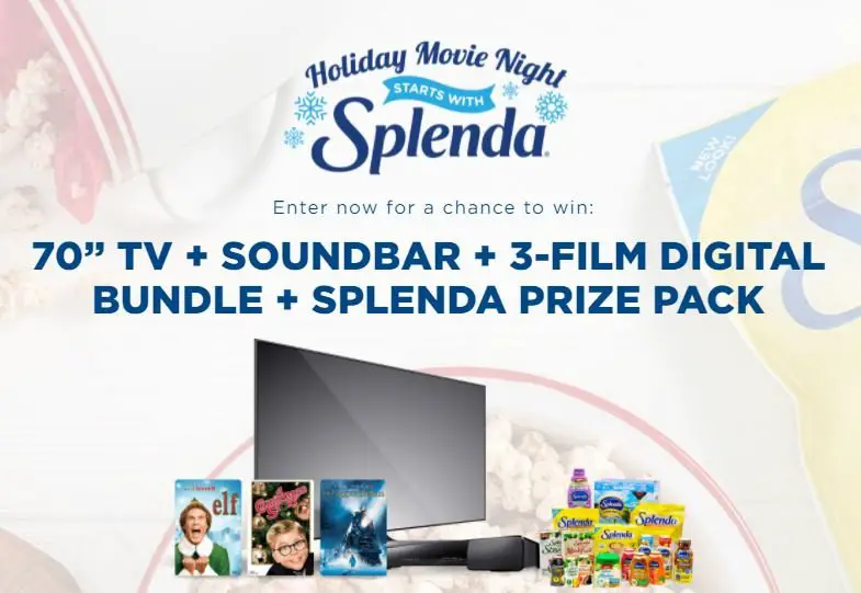 The Holiday Movie Night Starts With Splenda Sweepstakes is offering you a chance to win a 70" TV, sound bar, 3 film digital movie bundle and a Splenda prize pack.