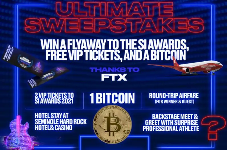 Enter the Sports Illustrated Awards FTX Ultimate Sweepstakes and you may be the lucky winner of a Bitcoin and a trip for 2 to Florida plus tickets to attend the Sports Illustrated Awards.