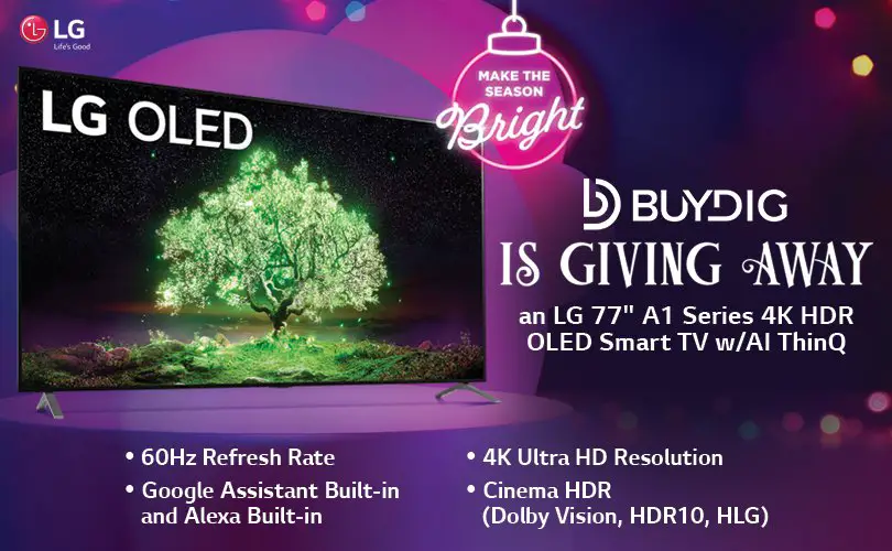A LG 77" A1 Series 4K HDR Smart OLED TV is up for grabs in the BuyDig LG Smart OLED TV Sweepstakes