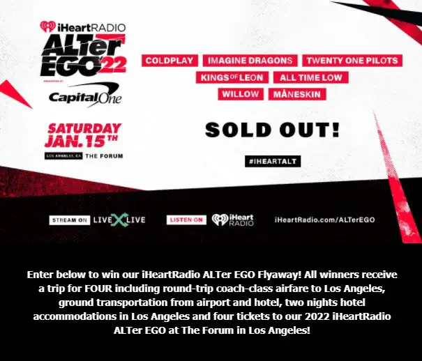 The iHeartRadio Alter Ego Flyaway Sweepstake is offering you a chance to win a trip for four people to LA, California plus tickets to the 2022 iHeartRadio Alter Ego music festival in January.