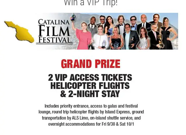 Win a 2 night stay on Catalina Island in California, 2 VIP access tickets to the Catalina Film Festival and two helicopter flights to the island worth $900.00!