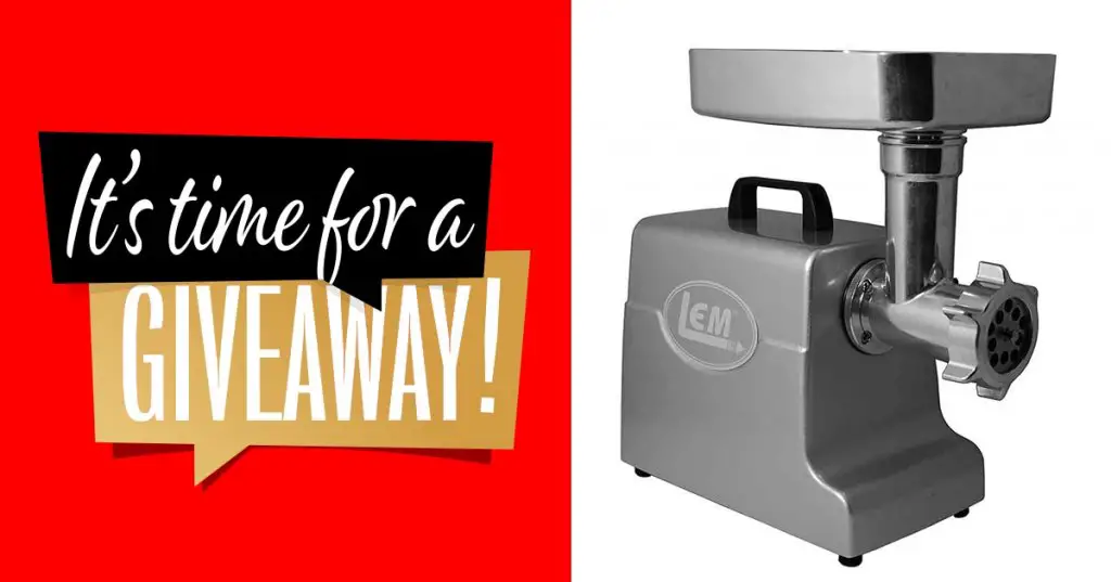 The meat grinder up for grabs is the LEM Mighty Bite Aluminum Grinder.