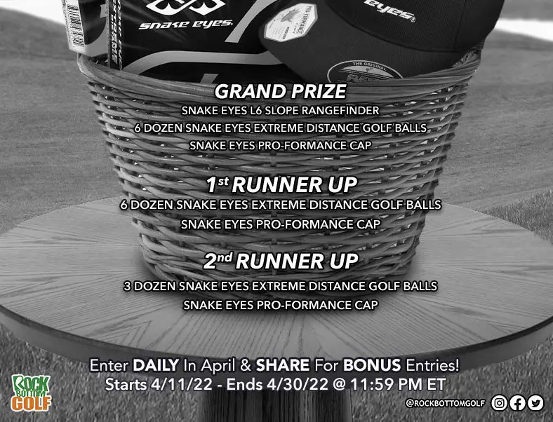 Enter the Rock Bottom Golf Snake Eyes Giveaway for a chance to win a golf gear package that includes Snake Eyes Rangefinder, 72 Golf Balls and a hat {Pro-formance Cap}. The package is worth $334.