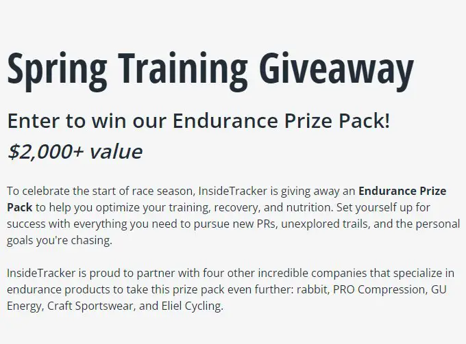 $2,000 Endurance Prize Pack- Includes an Inside Tracker Ultimate Plan, DNA Kit, $300 Rabbit Gift Card, Compression Socks, $100 Eliel Cycling Gift Card and more