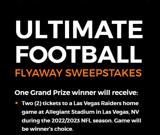Enter the Allegiant Air Ultimate Football Flyaway Sweepstakes for your chance to win a trip for 2 to Las Vegas for a Las Vegas Raiders home game.