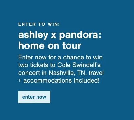 Entering the Ashley Pandora Home On Tour Sweepstakes offers you a chance to win a trip to a Cole Swindell concert in Nashville.