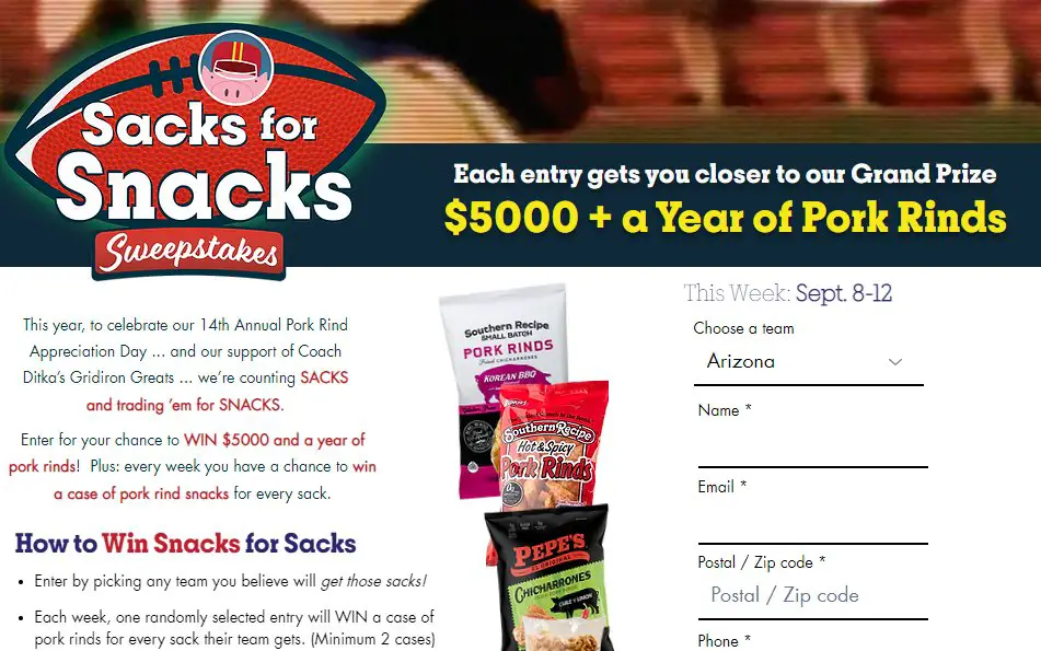 Enter the Sacks For Snacks Sweepstakes for a chance to win a year of free pork rinds and $5,000 cash.