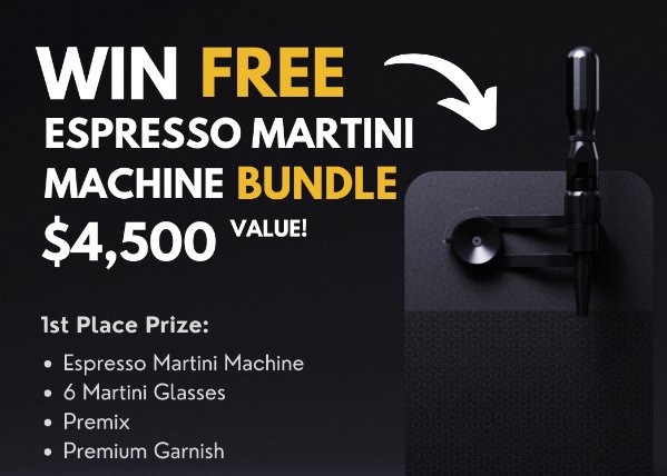 The prize bundle includes an Espresso Martini Machine, Martini Glasses (6) and more.