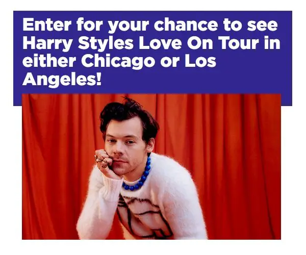 Enter the latest sweepstakes from SiriusXM for a chance to win two tickets to Harry Styles Love On Tour concert either in Chicago or Los Angeles with airfare and two nights hotel accommodation.