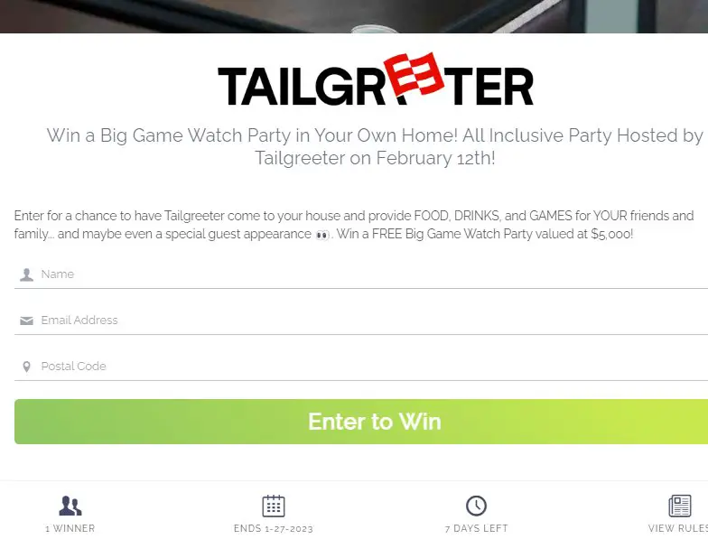 Tailgreeter Big Game Watch Party Giveaway - Win A $5,000 Super Bowl Viewing Party - Tailgreeter