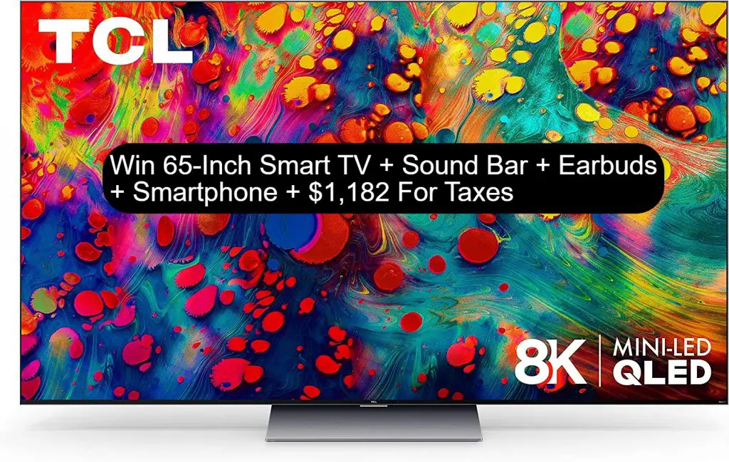 The package includes a 65-inch Class 6-Series, 8K Mini-LED QLED Smart TV, TCL Smart Sound Bar with Wireless Sub Woofer, TCL Moveaudio S180 Wireless Earbuds, D100TCL Stylus 5G Smartphone, plus a check for $1,182 to help with taxes or whatever the winner desires to use it for.