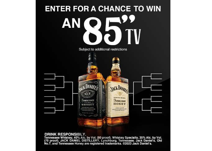 Jack Daniels is celebrating March Madness with an instant win game! Click on the link below and follow the instructions and be one of the instant winners of an 85" TV! Watch one of the most exciting games of the year on a beautiful, brand new TV.