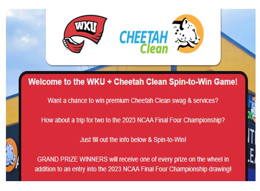 Winners will win unlimited offers courtesy of Western Kentucky and Cheetah Clean. Spin and win free NCAA Final Four tickets, car wash coupons, free t-shirts, 50% off Cheetah Clean Certificate, and more.
