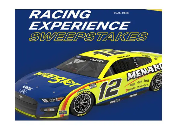 Enter the Menards Wrangler Racing Experience Sweepstakes to win exciting prizes including race tickets.