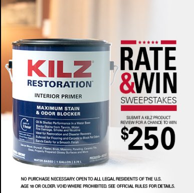 Leave a review and earn a free $250 Gift Card courtesy of Kilz. Did you recently complete a Kilz project? Feel free to share your recent experience in the Kilz Product Review Sweepstakes!
