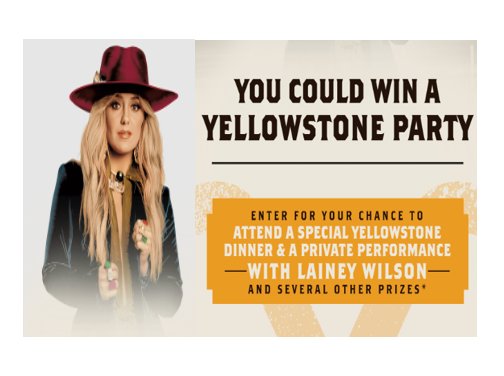 Up for grabs in the Lone River Yellowstone Sweepstakes is a trip for 2 for a private dinner & concert with Lainey Wilson.