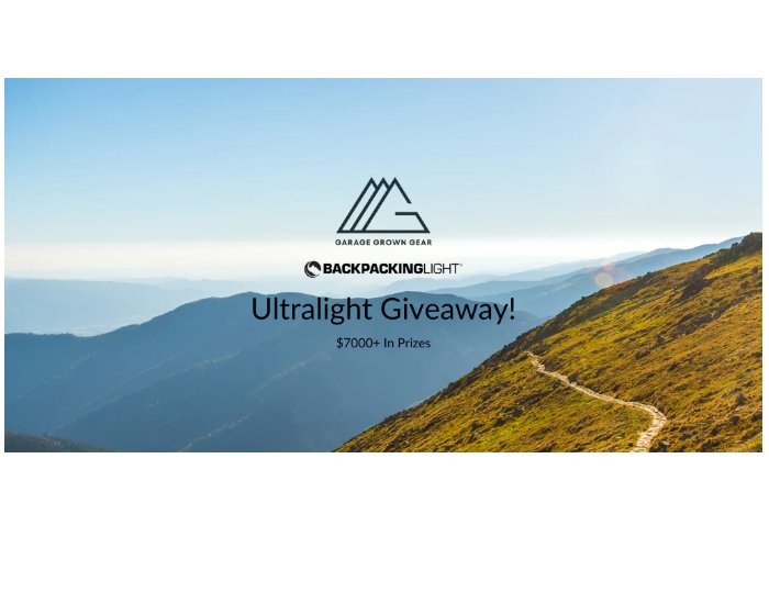 1 Winner: A Choice of An Outdoor Backpack, Outdoor Shelter and Quilt Offered, Lifetime Membership to Backpacking Light, Large Bear Bag from Neighborhood Packs, Coalatree Kachula Blanket, Enlightened Equipment Booties, Fozzils Prize Pack, $100 Virga Packing Company Gift Card, Klymit Travel Blanket, Red Paw Packs Fanny Pack, Kula Cloth Prize Pack, Ridge Merino Merch, Sawyer Stay Outside Pack, A Pair of FarPointe Outdoor Gear Socks, Bottle Pot from Vargo Outdoors, Hyperlite Mountain Gear Fanny Pack, Give'r Gloves, Hat and Coozie, Mayfly Ultralight Equipment Shoes, Pouches from Mayfly Ultralight Equipment, Three (Winner's Choice) FarOut Trail Guides, Hartford Gear Co. Packing Pod Set, One Box (6ct) of Cascadia Coffee, Bandana from Gnara, Large Bear Bag from Hilltop Packs, Apex Giant Trowel (Small)1 Winner: A Choice of An Outdoor Backpack and Outdoor Shelter, One Year Membership to Backpacking Light, A Pair of 3D Sandals, Medium Bear Bag, Loafer Hammock, Fozzils Prize Pack, $100 Virga Packing Company Gift Card, Kula Cloth Prize Pack, Ridge Merino Merch, Sawyer Stay Outside Pack, Klymit LIght Tube, Vargo Outdoors Mug and Coffee Filter, Hyperlite Mountain Gear Backpack Pods (Set), Give'r Gloves and Hat, A Pair of Camp Shoes, UltraLiteSacks Pouches, One Napacks Pouch, Six Moon Designs Ultralight Daypack, 2 (Winner's Choice) FarOut Trail Guide, Hartford Gear Co. Pouch Set, One Box (6ct) of Cascadia Coffee, Gnara Sticker Sheet, Medium Dry Bag Kit, One Large Dog Bone