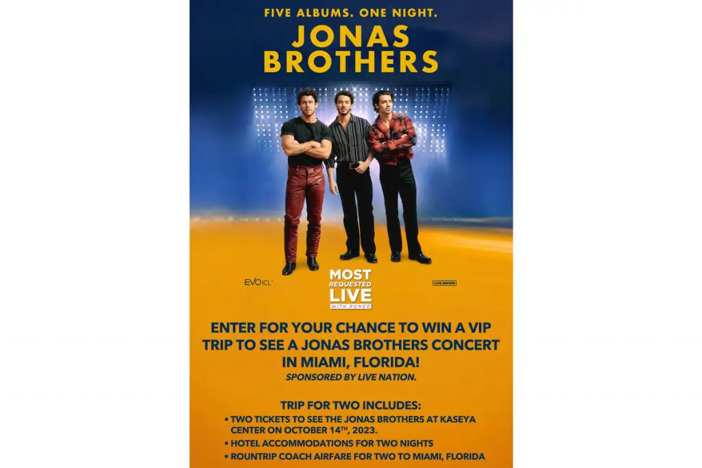 1 Winner: A Trip for Two to the Jonas Brothers Concert in Miami Florida on October 14, 2023 with Airfare, Two Nights Hotel Accommodation and Concert Tickets.Entry Form