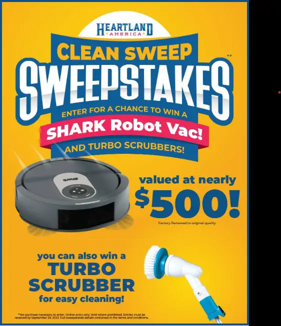 Win a free Shark AI Robot Vacuum Cleaner plus a Turbo Scrubber in the Heartland America Clean Sweep Sweepstakes.