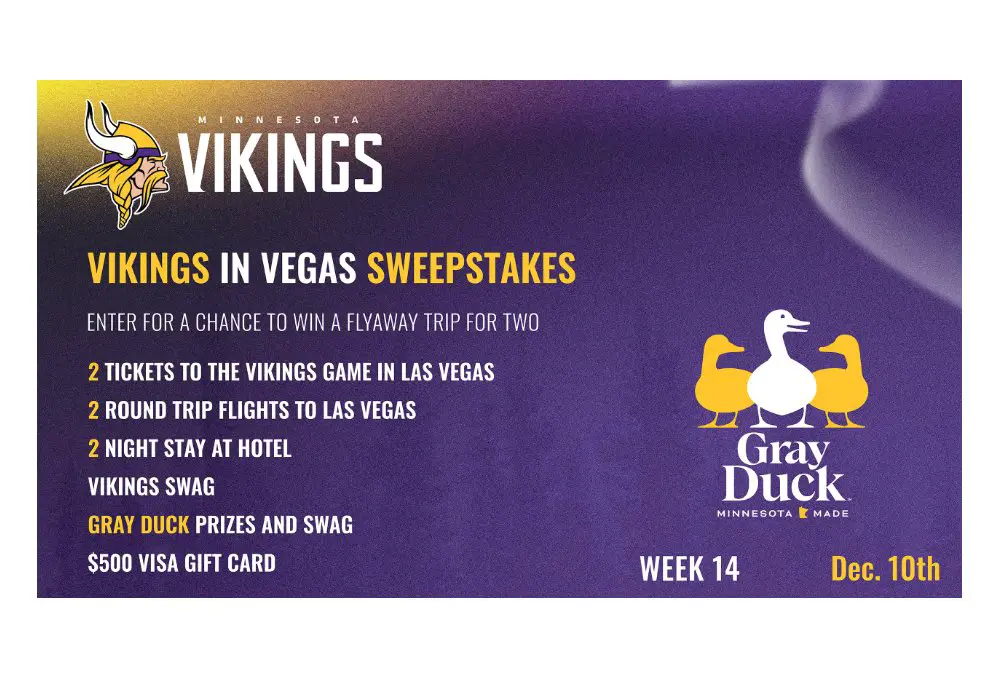 1 Winner: A Trip for Two to Las Vegas for the Vikings vs. Raiders Game with Airfare, Two Nights Hotel Accommodation, Two Game Tickets, Official Grey Duck Merch and $500 Prepaid Gift CardEntry Form