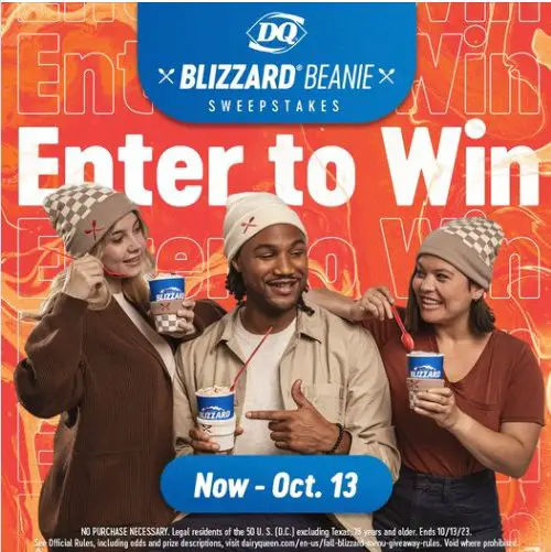 The DQ Fall Blizzard Beanies Sweepstakes is open to legal residents of the 50 United States (excluding Texas) and the District of Columbia who are at least 18 years old at the time of entry.
